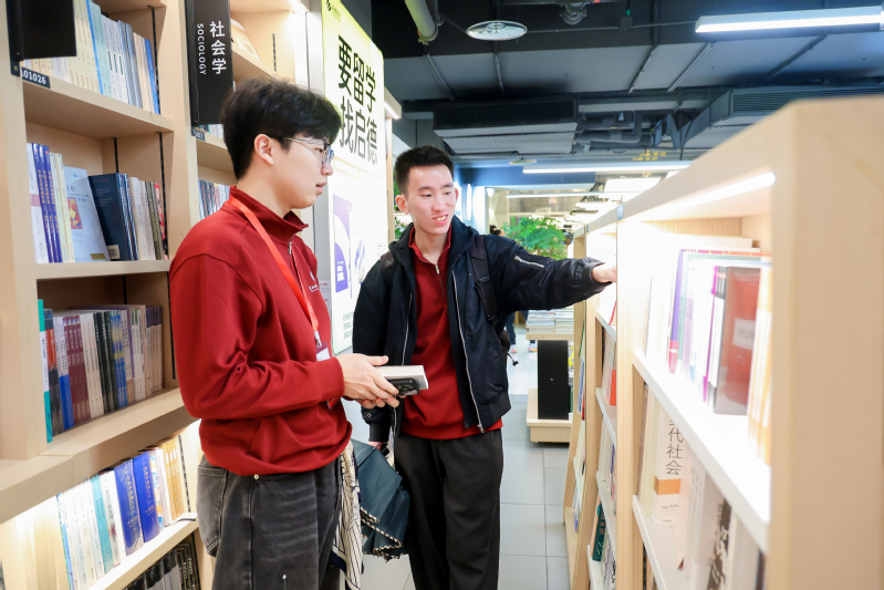 天色已晚,各小组分别前往中心书城。一踏入书城,墨香与纸韵交织着窗外的微凉晚风,瞬间吹散了一日的疲惫。伙伴们或分散流连,或不时聚首:有人在文学专区驻足,指尖轻触经典著作的书脊,仿佛与历代文人展开一场隔空晤谈;有人被社科书籍吸引,沉心于多元思想的交锋之中,悄然拓展着认知的疆域。没有匆忙的步履,没有纷扰的杂念,唯有文字的引力与同伴的相伴,在静谧的时光里缓缓漫溢。